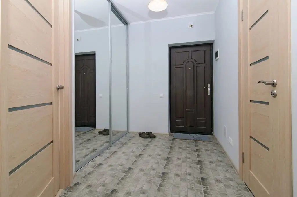 In hol, un plus de spatiu pentru depozitare gratie dulapului cu usi glisante; oglinzile ofera profunzime spatiului si lasa impresia ca spatiul pare mai mare decat in realitate