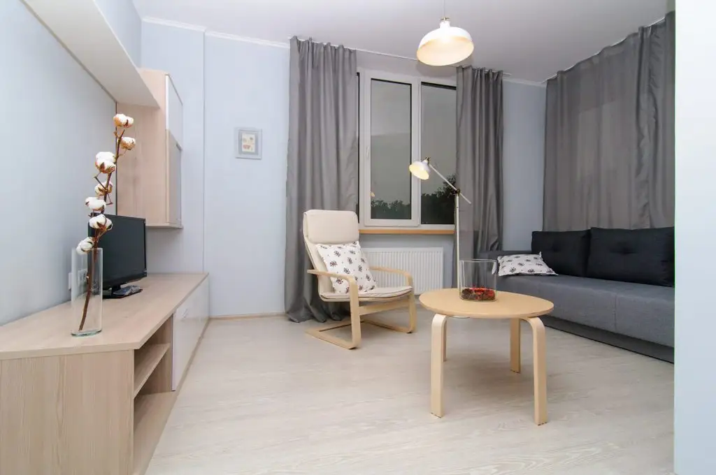 Intrucat, suprafata apartamentului nu permite o abordare mai ampla a decorului, designerii s-au concentrat pe a obtine maximum din amenajare folosind culori si finisaje care sa imbogateasca spatiul. Cromatica folosita este cea a unor nuante de albastru deschis, combinat cu gri si nuanta naturala a lemnului.