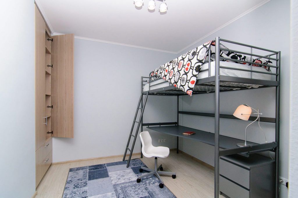 Pentru copil, a fost gandit un sistem cu birou si pat integrat maximizand astfel spatiul avut la dispozitie. Alaturi de dulapul de care mentionam mai devreme, s-a reusit conturarea unui spatiu confortabil si functional pentru copilul familiei.