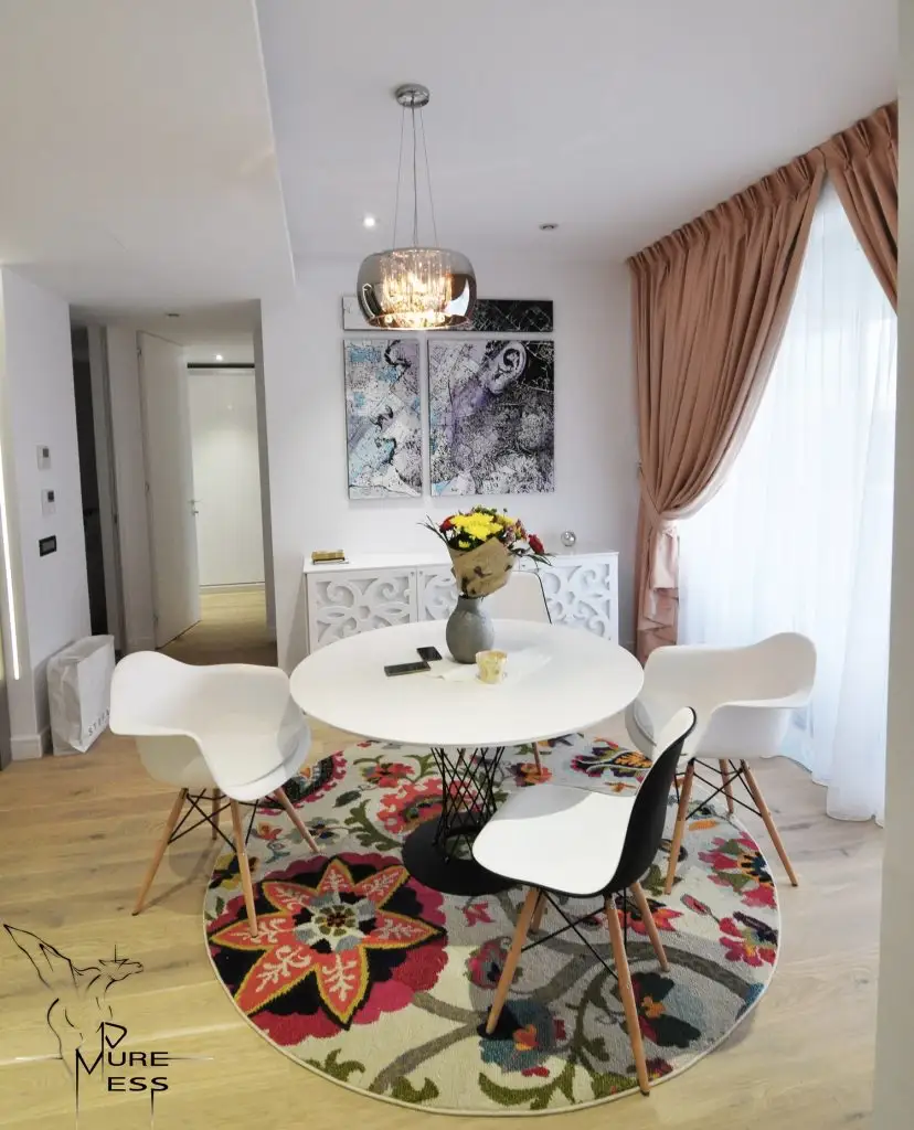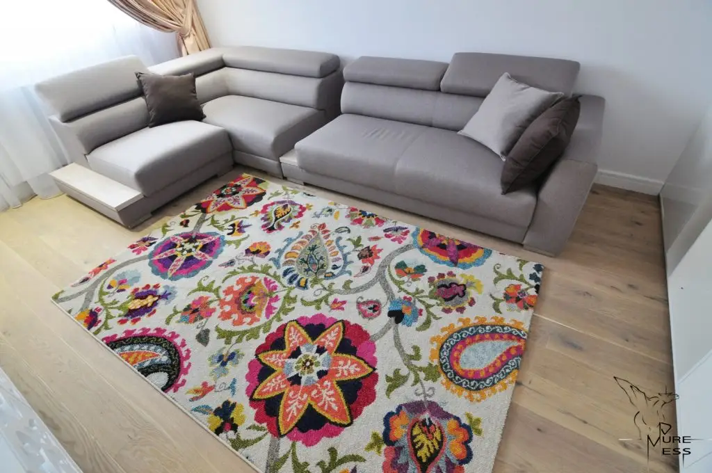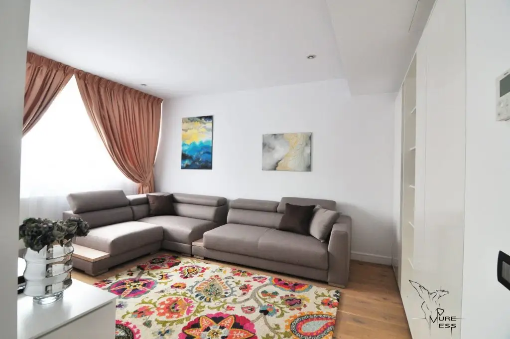 O amenajare unitara personalizata prin accentele de culoare si texturi date de covoare si tablouri, o sursa de inspiratie pentru toti cei care isi doresc sa amenajeze spatii cu o configuratie asemanatoare.
