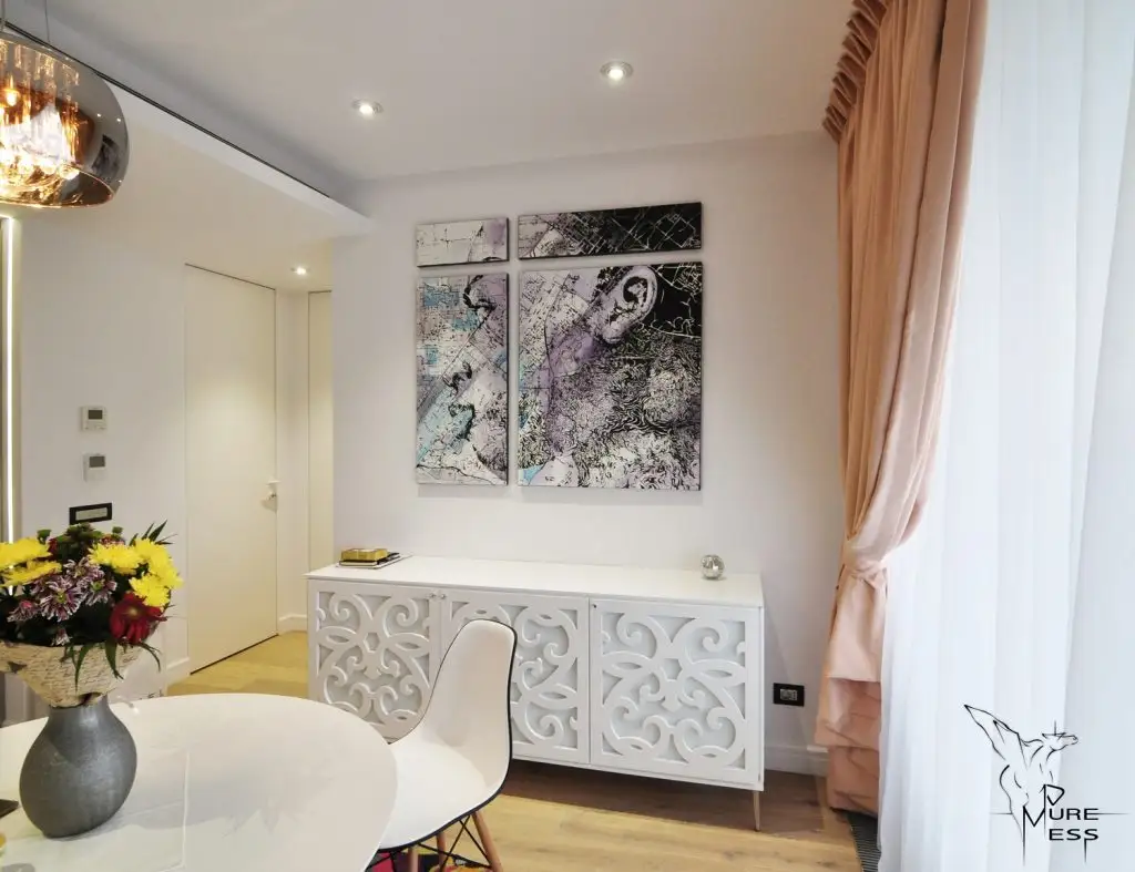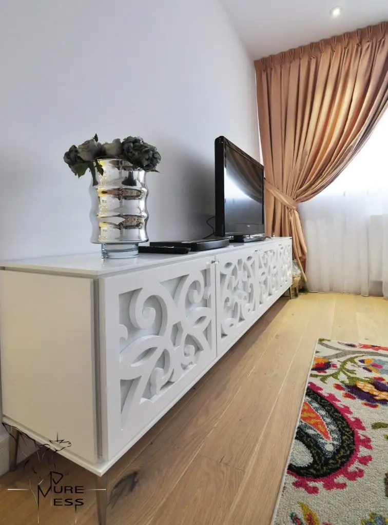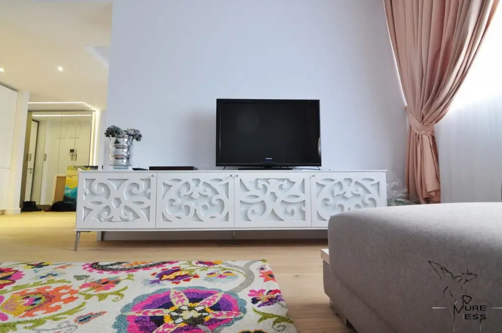 Deosebite sunt piesele de mobilier care atrag atentia prin designul lor, anume cele 2 console din MDF traforat, una in zona de luat masa si una in living, ambele avand rol de depozitare. Nu intamplatoare este si alegerea covoarelor cu imprimeu floral sugerand feminitate si asigurand in acelasi timp o continuitate intre cele 2 spatii semi-deschise ale apartamentului aferente zonei de zi.