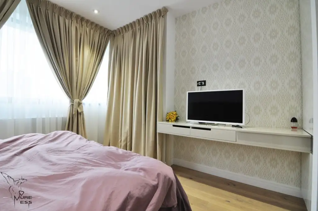 Dormitorul matrimonial a fost proiectat pentru a crea o imagine care favorizeaza o energie pozitiva si odihnitoare. Tapetul marcheaza o zona de accent discret conturata. Tonurile de beige ale draperiilor au fost atent alese pentru a permite patrunderea unei cantitati potrivite de lumina, armonizandu-se cu nuantele tapetului si tabliei de pat.