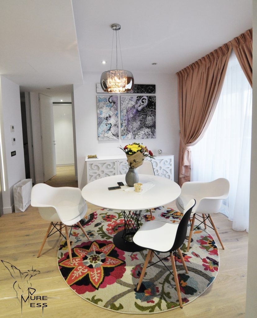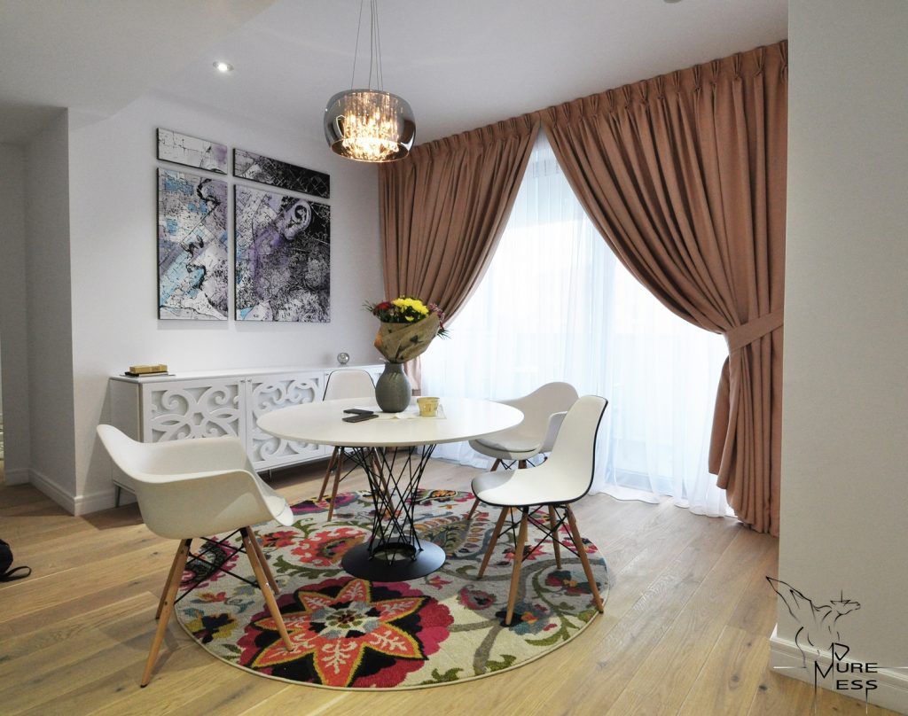 Deosebite sunt piesele de mobilier care atrag atentia prin designul lor, anume cele 2 console din MDF traforat, una in zona de luat masa si una in living, ambele avand rol de depozitare. Nu intamplatoare este si alegerea covoarelor cu imprimeu floral sugerand feminitate si asigurand in acelasi timp o continuitate intre cele 2 spatii semi-deschise ale apartamentului aferente zonei de zi.
