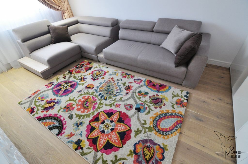 O amenajare unitara personalizata prin accentele de culoare si texturi date de covoare si tablouri, o sursa de inspiratie pentru toti cei care isi doresc sa amenajeze spatii cu o configuratie asemanatoare.