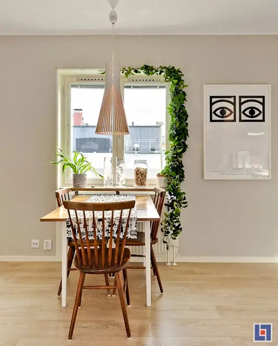 Masa pentru dining asezata in dreptul ferestrei.
