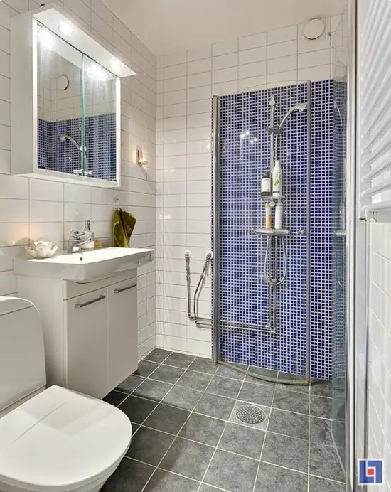 Flisele mici albastre au rolul de a scoate in evidenta zona dedicata dusului, fiind un accent deosebit, util pentru orice alta baie mica.