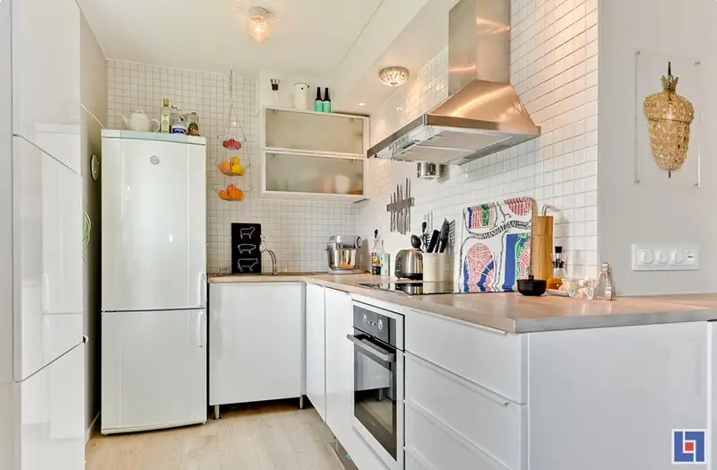 Bucataria compacta ofera strictul necesar plus diferite dulapuri folosite pentru stocare. Designul nu este unul complex, ci mai degraba centrat pe functionalitate, asa cum stilul scandinav ne-a obisnuit.