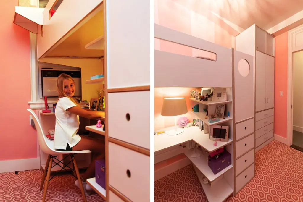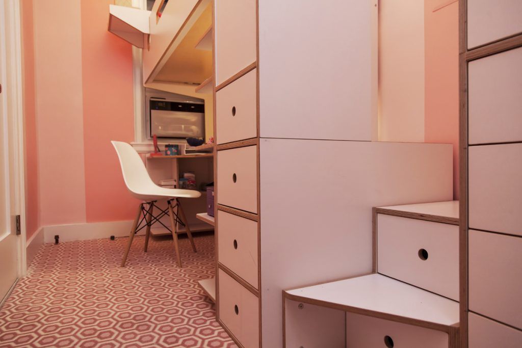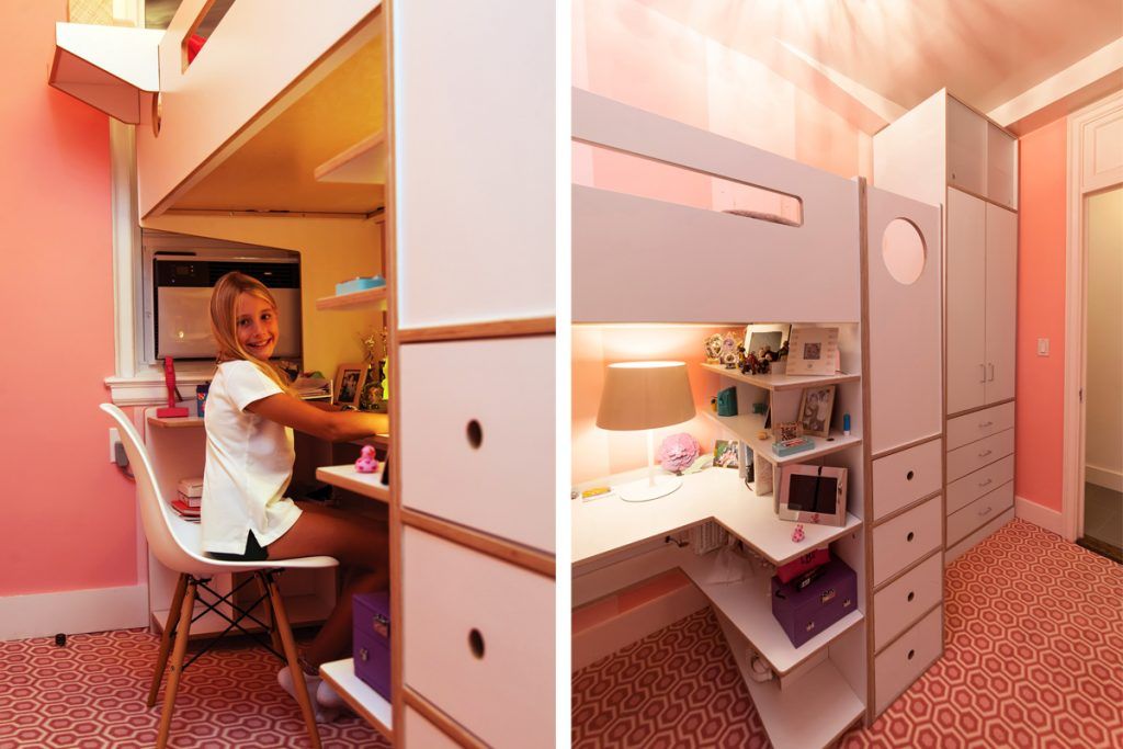 Care a fost solutia? Amenajarea unui pat suspendat deasupra unui birou care sa ofere si mult spatiu pentru depozitare.