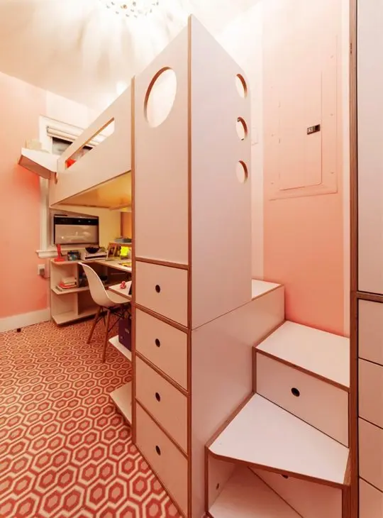 Desi spatiul este foarte restrans, fiecare metru patrat este valorificat la maximum prin excelenta idee a mobilierului multifunctional ce armonizeaza spatiul pentru dormit cu cel pentru lucru sau facut teme si cel pentru depozitare.