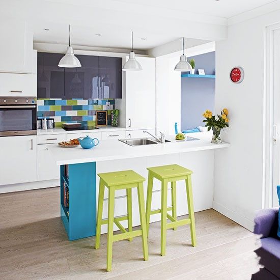 Albastrul ofera si el o multitudine de posibilitati atunci cand vorbim deamenajarea bucatariei. De la albastru cobalt la tonurile deschise ale turcoazului, aceasta culoare se asorteaza de obicei cu dulapurile bucatariei sau cu blatul. Alegeti in acest sens, variatiile cu alb sau cu lemn inchis sau deschis la culoare in functie de nuanta de albastru folosita.