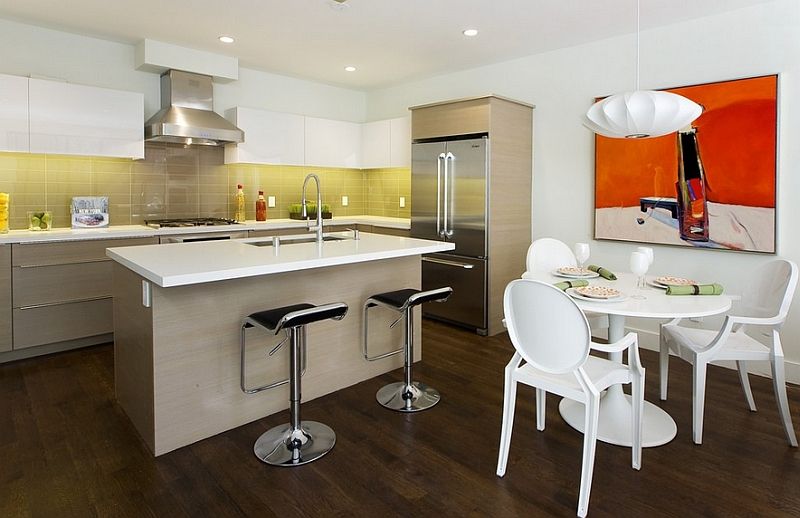 Indrazniti si folositi galbenul in nuante subtile pentru a avea un aspect fresh, calduros si stralucitor in acelasi timp. De la un corp de iluminat pana la o vaza cu flori sau chiar un perete vopsit in galben, bucataria voastra va fi cu adevarat moderna si va oferi o ambient calduros.
