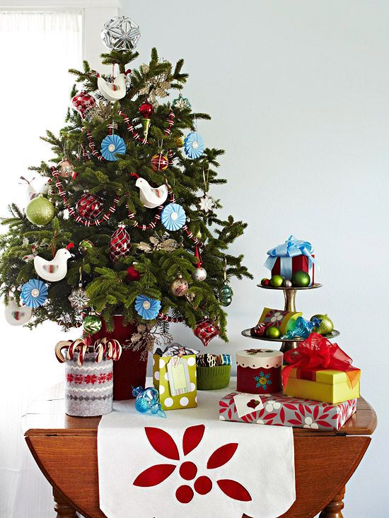 Folositi diferite texturi si culori pentru a scoate in evidenta decorul festiv. Daca spatiul nu va permite amplasarea unui brad, faceti unul pe masura, mic care sa poata sta pe o masuta. Abordati situatia intr-o maniera originala: creati un bradut din luminite sau din globulete.