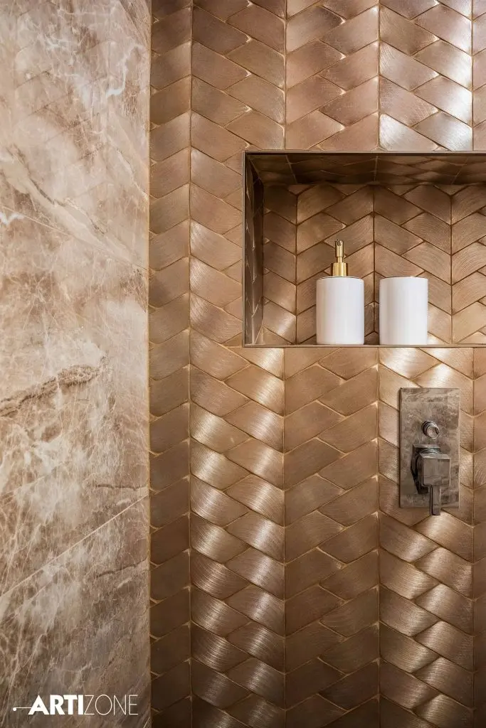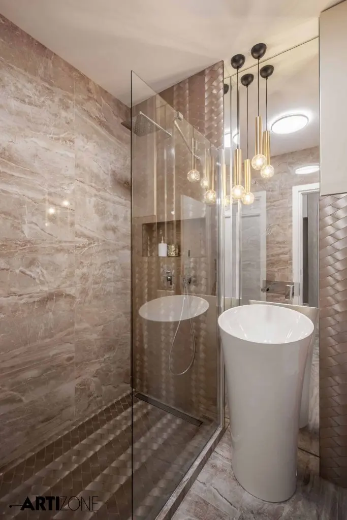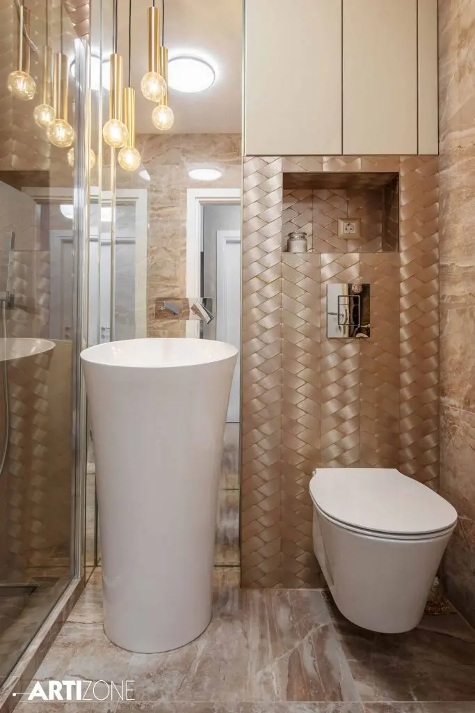 Initial, baia era prevazuta cu cada insa optiunea clientei a fost sa o inlocuiasca cu un dus de tip walk-in, separat de lavoar printr-o piesa de sticla fixa. Nuantele calde, nisipii, creeaza o atmosfera eleganta si relaxanta in acelasi timp. Piesa de rezistenta a baii o reprezinta mozaicul metalic auriu dispus sub forma de impletitura.