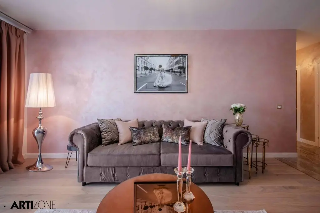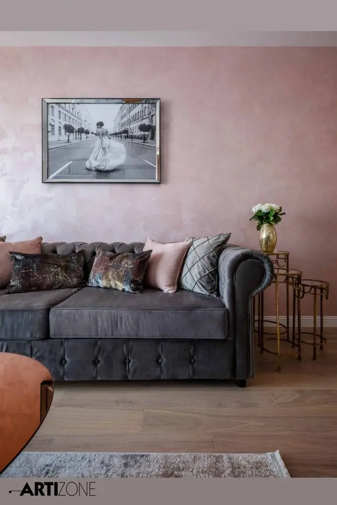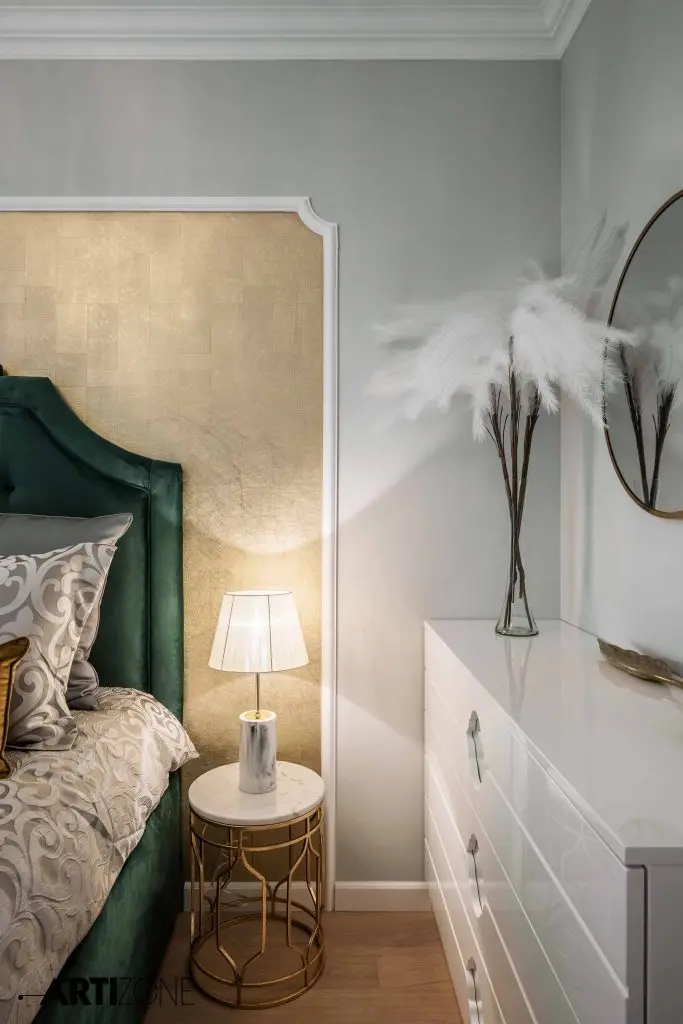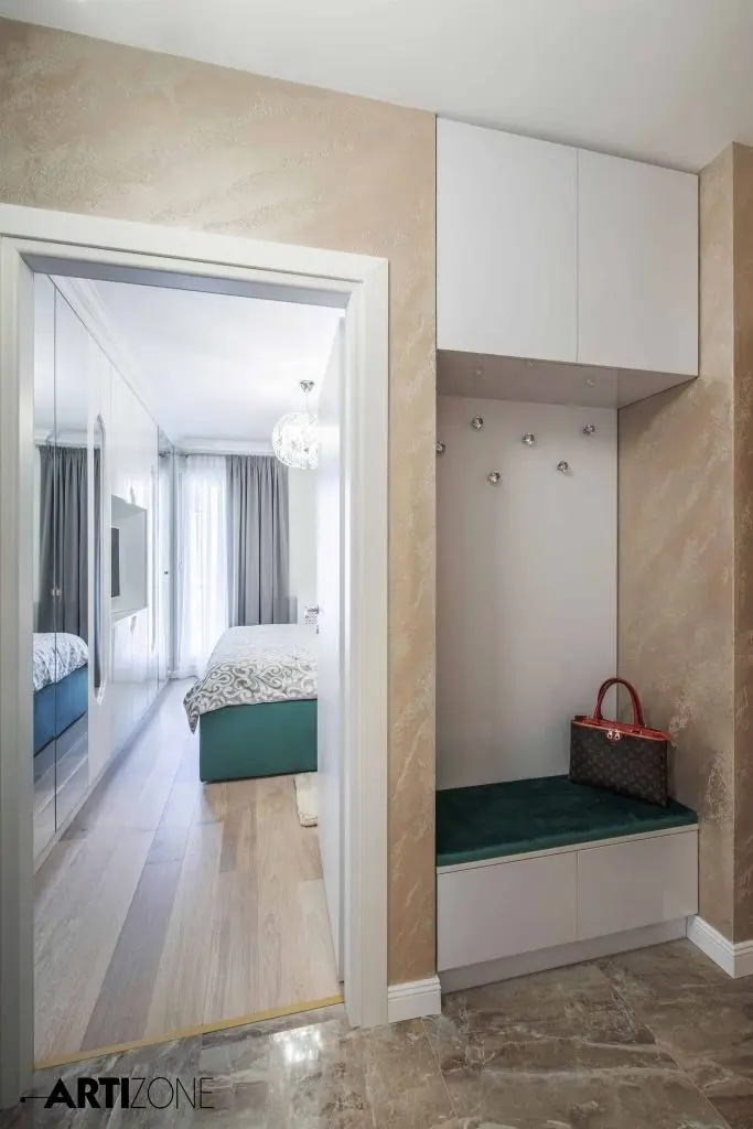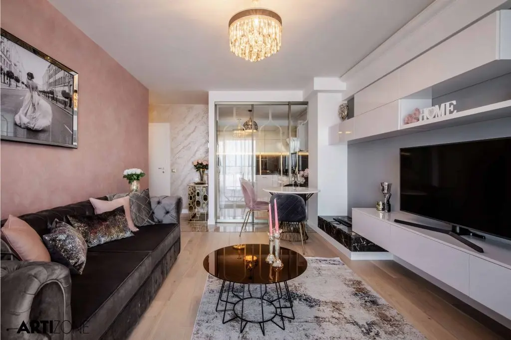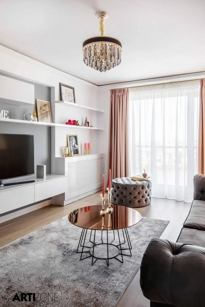 “Beneficiara si-a dorit o amenajare calda, in nuante pastel si cu accente lucioase, aurii, argintii si oglinda. Am adaugat accente de gri si putin negru pentru dramatism.”