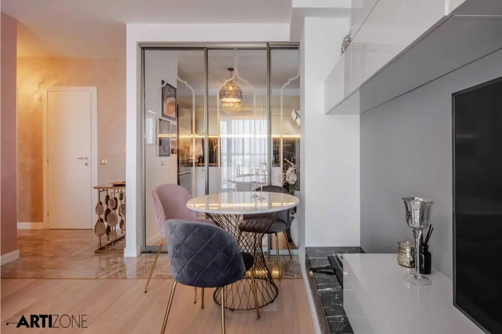 Optiunea pentru usi glisante la bucatarie, cu chenar sablat, asigura continuitatea vizuala spatiilor si mareste optic spatiul redus al bucatariei; in acelasi timp separa functional zonele, intruct beneficiara nu isi dorea sa se simta in living cand se gateste.