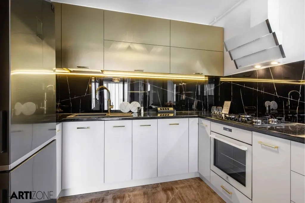 Bucataria iese in evidenta prin liniile moderne si finisajul auriu metalizat al corpurilor suspendate. Hota minimalista cu trei lamele albe accentueaza discret zona de gatit. Sticla printata, cu aspect de marmura neagra, face trecerea intre finisajele bucatariei.