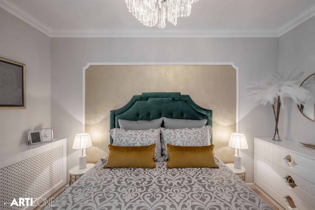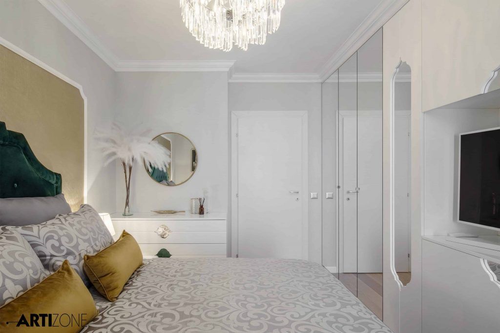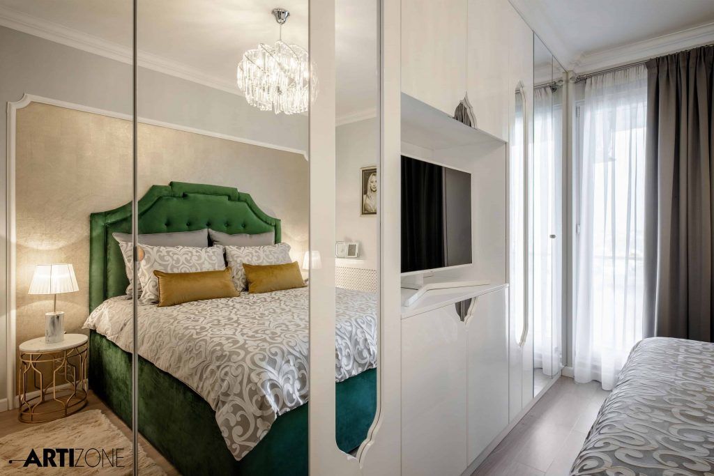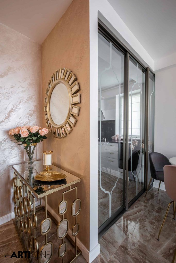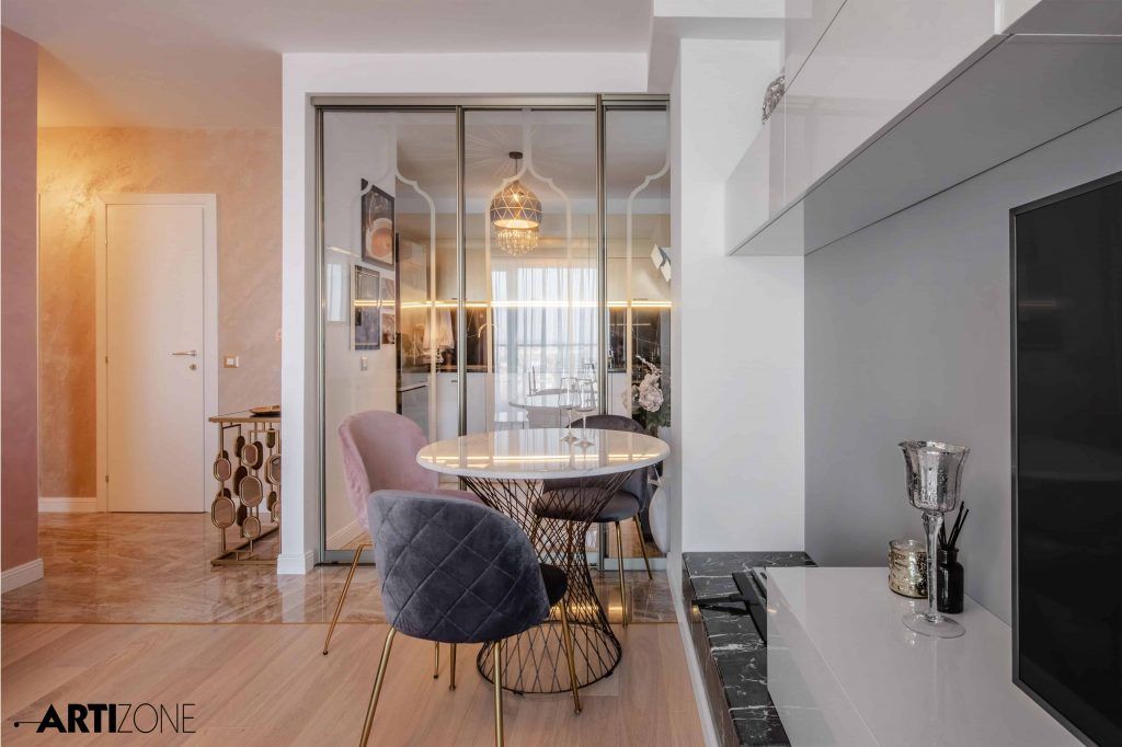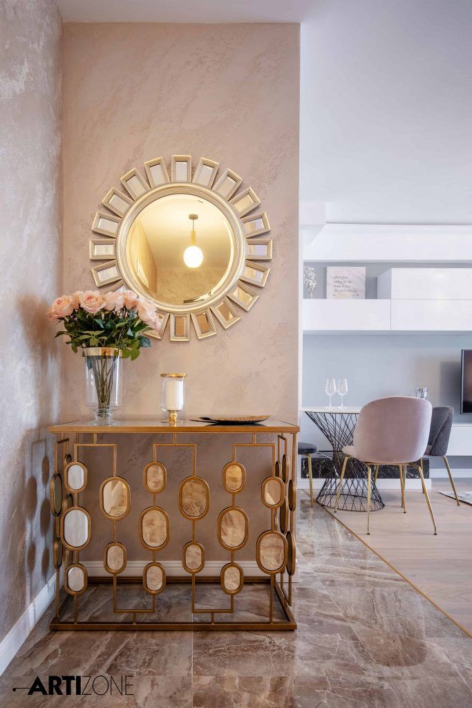 “Beneficiara si-a dorit o amenajare calda, in nuante pastel si cu accente lucioase, aurii, argintii si oglinda. Am adaugat accente de gri si putin negru pentru dramatism.”