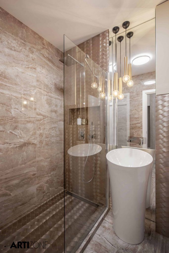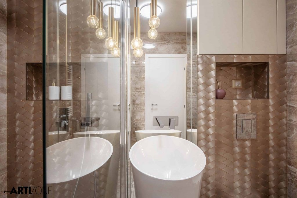 Initial, baia era prevazuta cu cada insa optiunea clientei a fost sa o inlocuiasca cu un dus de tip walk-in, separat de lavoar printr-o piesa de sticla fixa. Nuantele calde, nisipii, creeaza o atmosfera eleganta si relaxanta in acelasi timp. Piesa de rezistenta a baii o reprezinta mozaicul metalic auriu dispus sub forma de impletitura.