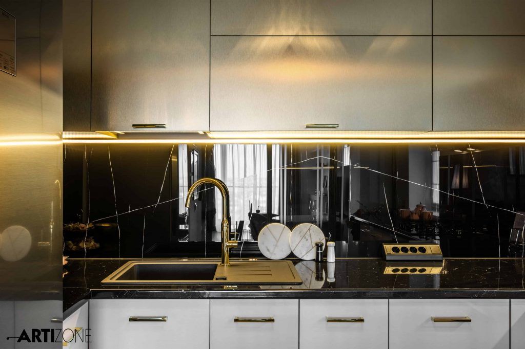 Bucataria iese in evidenta prin liniile moderne si finisajul auriu metalizat al corpurilor suspendate. Hota minimalista cu trei lamele albe accentueaza discret zona de gatit. Sticla printata, cu aspect de marmura neagra, face trecerea intre finisajele bucatariei.