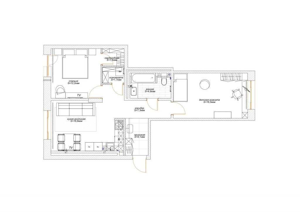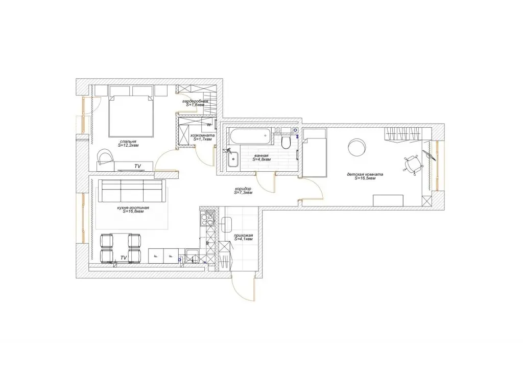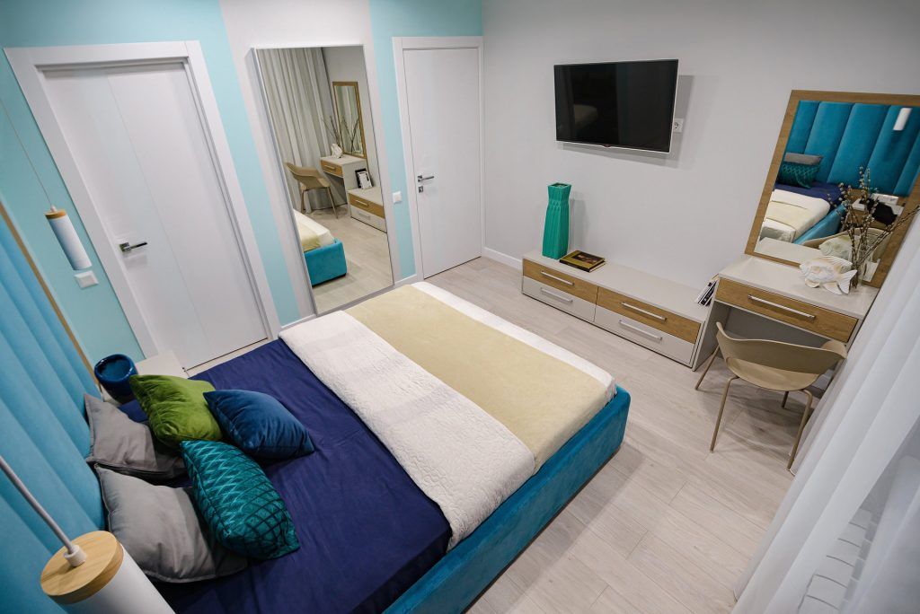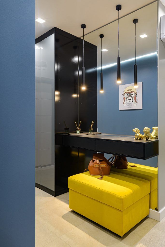 In urma compartimentarii propuse de designerul la care au apelat, Polina Marchenko, spatiul dormitorului a fost redus pentru a face loc unui dressing inchis, cu acces din dormitor si unei mici camere de depozitare, cu acces din hol.