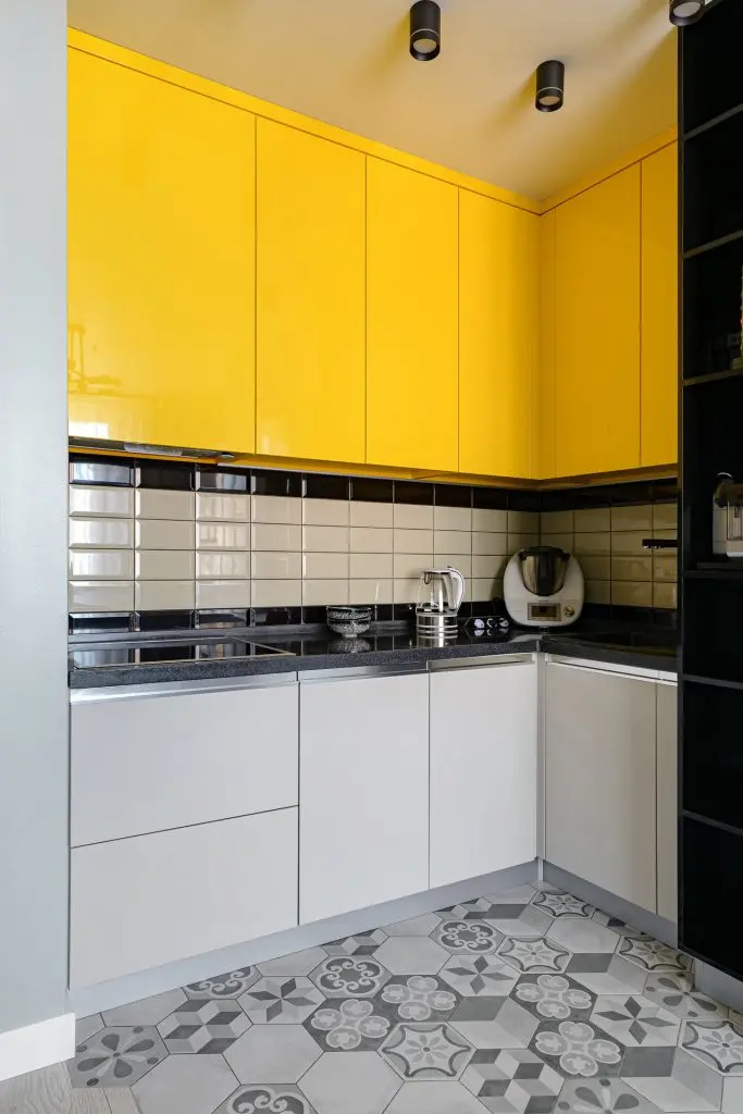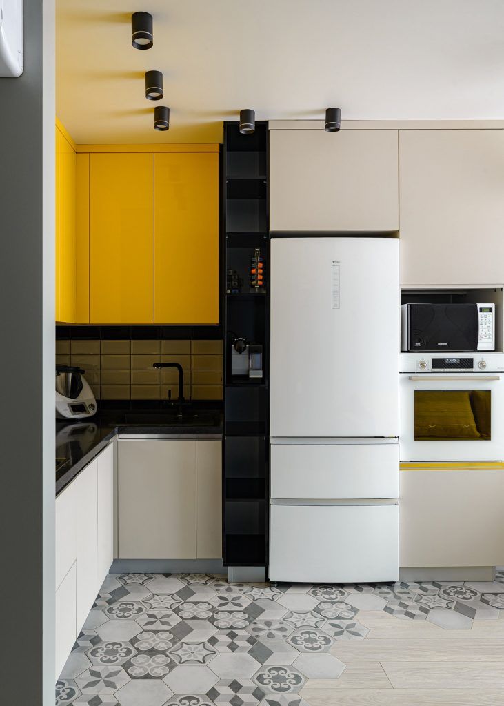 Inca de la inceput, sugestia designerilor a fost crearea unui decor neutru, ca fundal optim pentru accentele puternice si curajoase de culori (canapeaua galbena din living si dulapurile suspendate din bucatarie, obiectele de decor colorate).