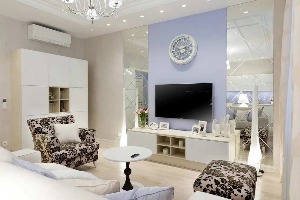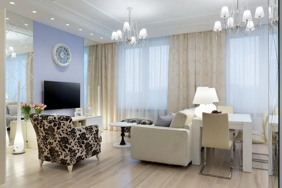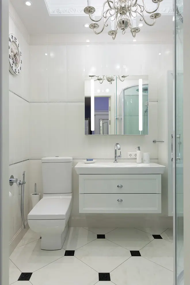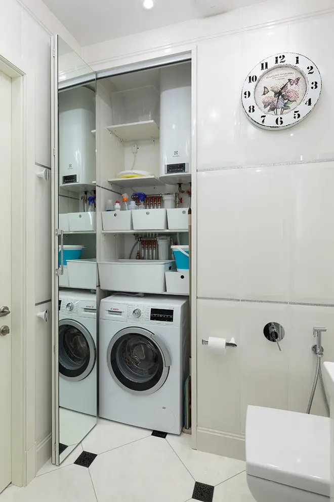Nu trebuie omis faptul ca atat electrocasnicele destinate incaperii, cat si spatiile de depozitare, se ascund elegant in spatele oglinzilor supradimensionate. Detaliile moderne sunt si in acest caz intrerupte de aparitia unor elemente cu design clasic: o lustra si un ceas de perete, fapt ce demonstreaza ca cele doua stiluri complet diferite pot contribui la o transformare de exceptie.