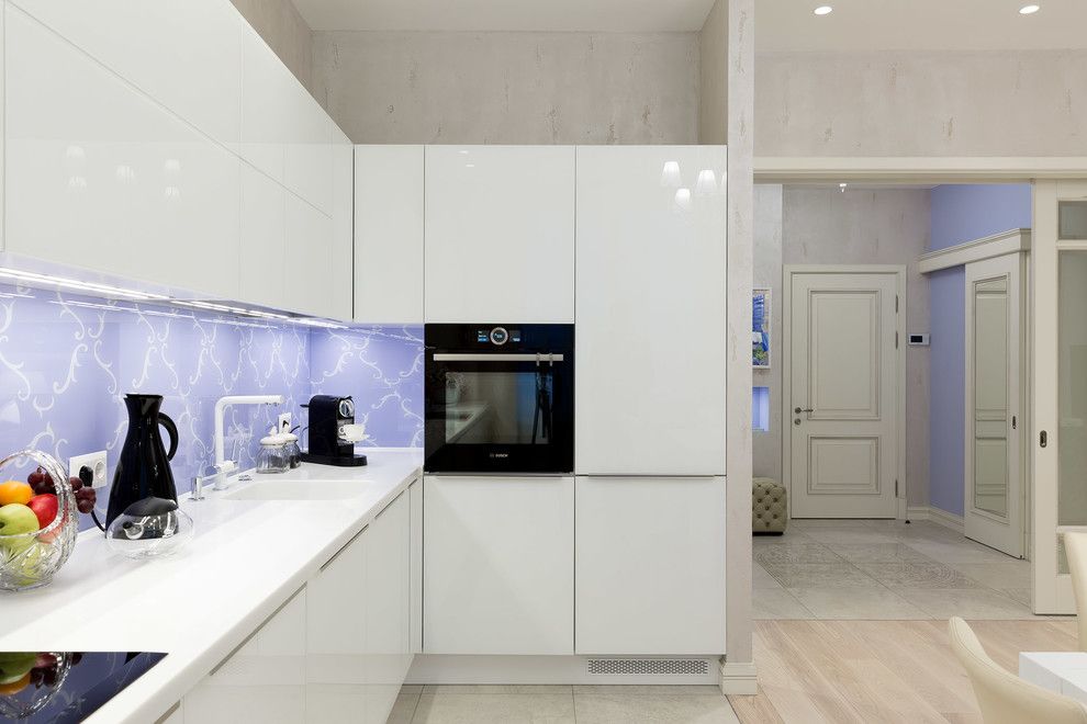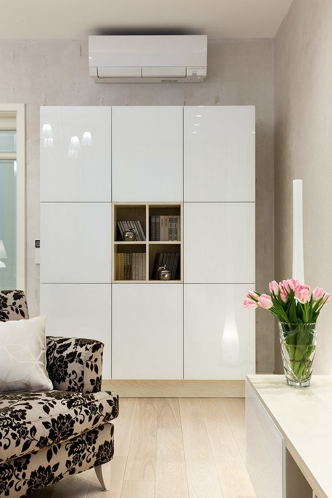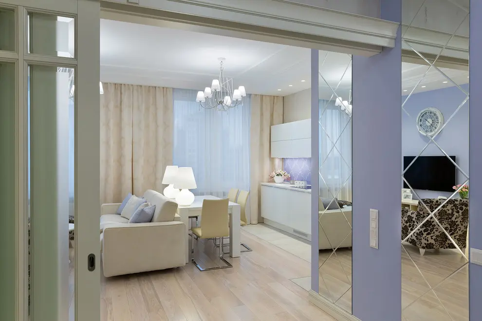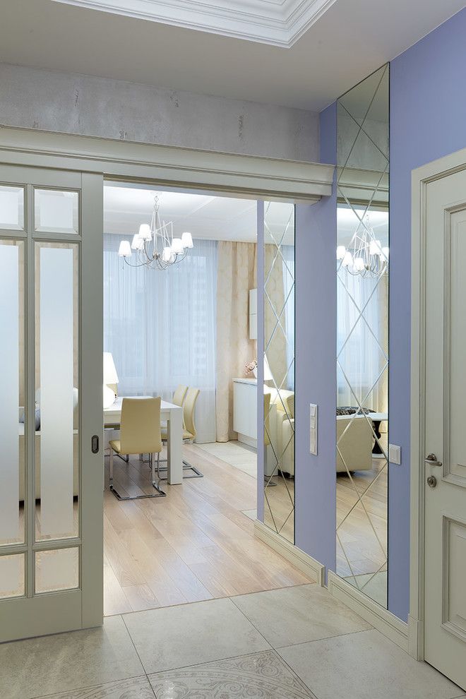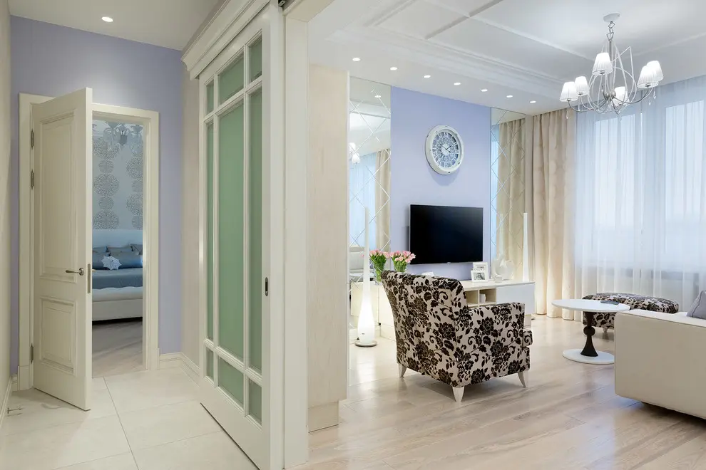 Folosirea indeosebi a lemnului natural si a albului imaculat la care se adauga detalii din sticla si accente coloristice de lavanda, permit conturarea unui spatiu luminos, delicat, cu finisaje feminine si simple. Aceste detalii sunt evidente in cazul holului aflat la intrarea in apartament si a open space-ului de mari dimensiuni regasit in spatele unei usi culisante formata din geamuri.