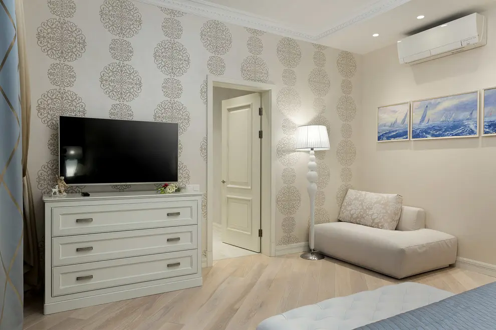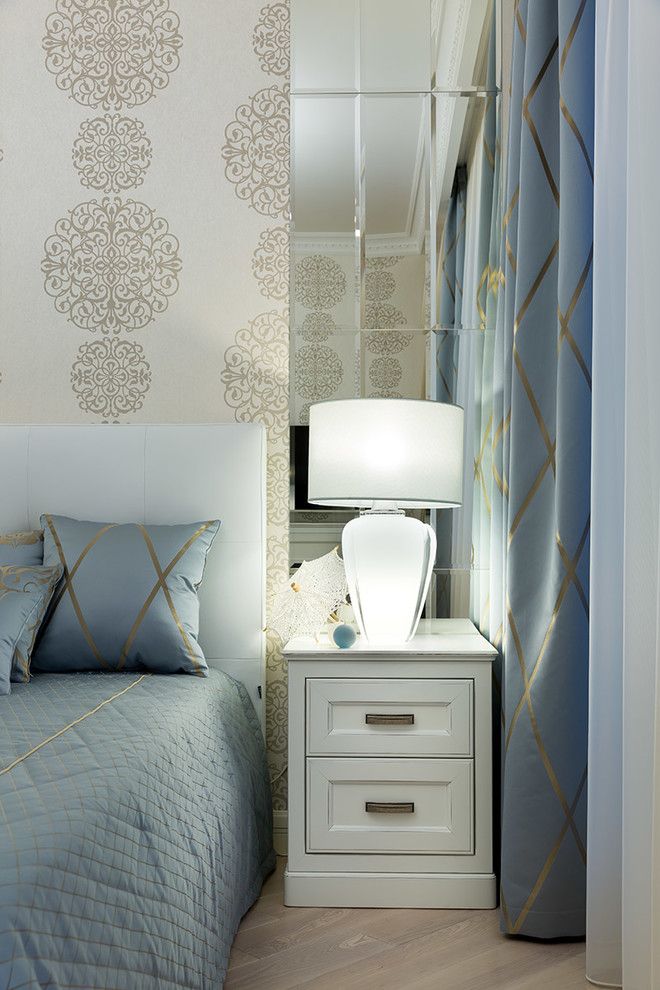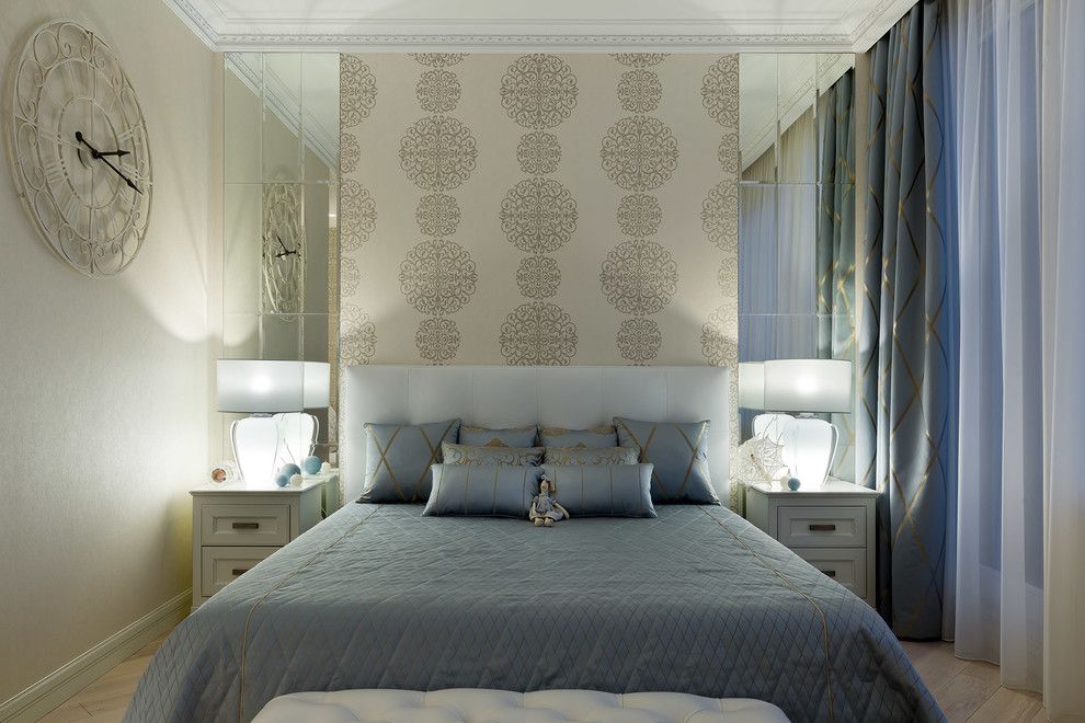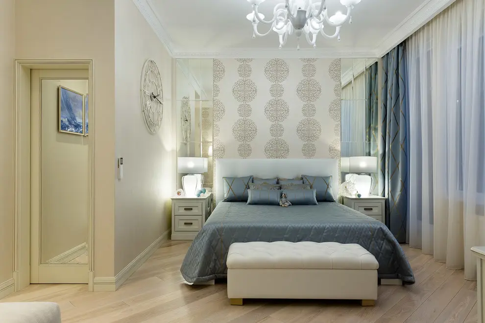 Dormitorul matrimonial pastreaza linia clasica si eleganta. Accesoriile textile ale patului dublu, pozitionat central, au detalii fine ce se armonizeaza perfect cu ornamentarea murala: tapet si oglinzi. Auriul subtil regasit in cazul draperiilor si al asternuturilor vine in completarea tapetului si celorlalte corpuri de mobilier.