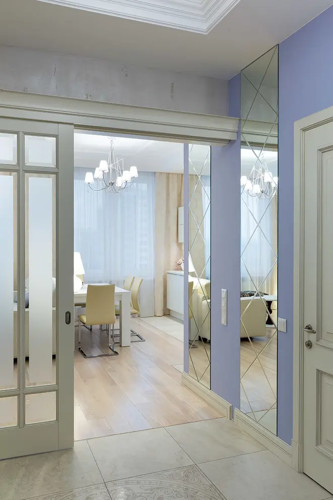 Tot ca accesoriu se face remarcat un tablou pastelat, pictat manual, una din amprentele artistice ale intregii locuinte. Oglinzile pozitionate de o parte si de alta a usii despartitoare devin element de legatura intre cele doua zone, formand astfel o linie imaginara continua in cazul in care se doreste mentinerea usilor deschise.