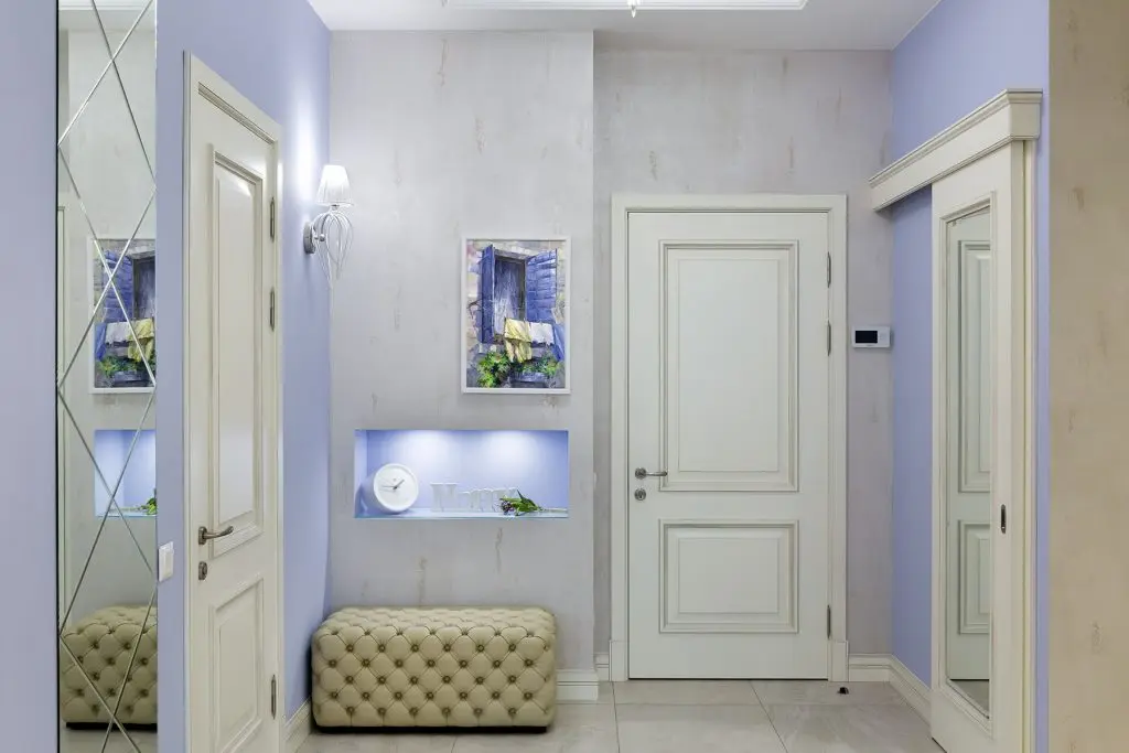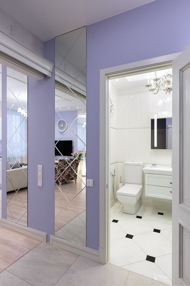 Spatiul holului este cel care face introducerea in cuprinsul povestii acestei transformari. In cazul peretilor se opteaza pentru o nuanta calda de lavanda si un tapet cu detalii fine. Micul spatiu de relaxare scoate in evidenta un taburet tapitat si decupeaza peretele pe care acesta se pozitioneaza, lasand sa iasa la iveal accesoriile luminate de ledurile incastrate.