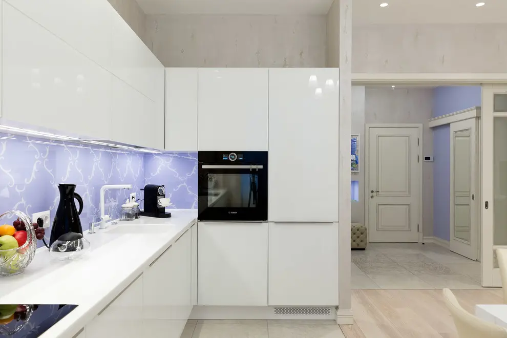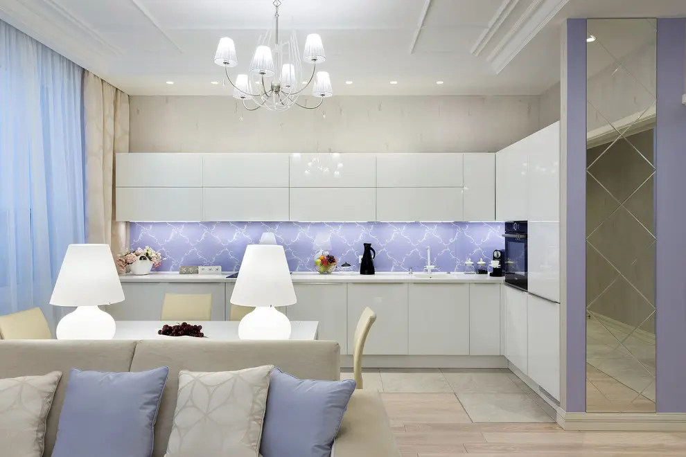 Bucataria se face remarcata prin minimalismul elegant caracteristic, un design scos la iveala si cu ajutorul ledurilor si nuantei peretelui care separa corpurile superioare de cele inferioare.Adaugarea celor doua veioze cu rol decorativ si functional, in zone de servire a mesei, face ca cele doua spatii sa se uneasca si sa formeze un intreg. .In ceea ce priveste accesorizarea intregului open space, aceaste se face cu ajutorul elementelor romantice.