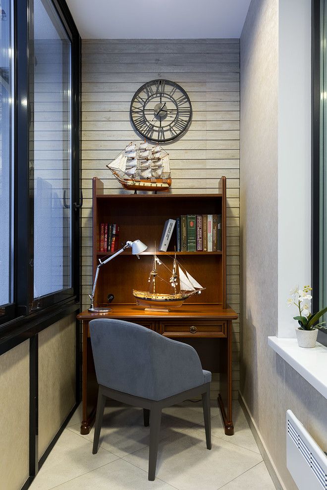 Spatiul balconului, aflat in continuarea dormitorului, este si el exploatat, transformandu-se intr-o incapere cu rol de birou, unde accentul principal cade pe ideea de antic si istorie, si asta datorita texturii cu aspect vintage a mobilierului.