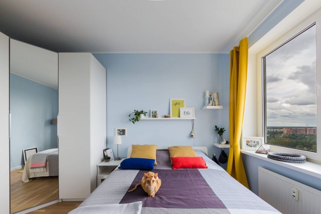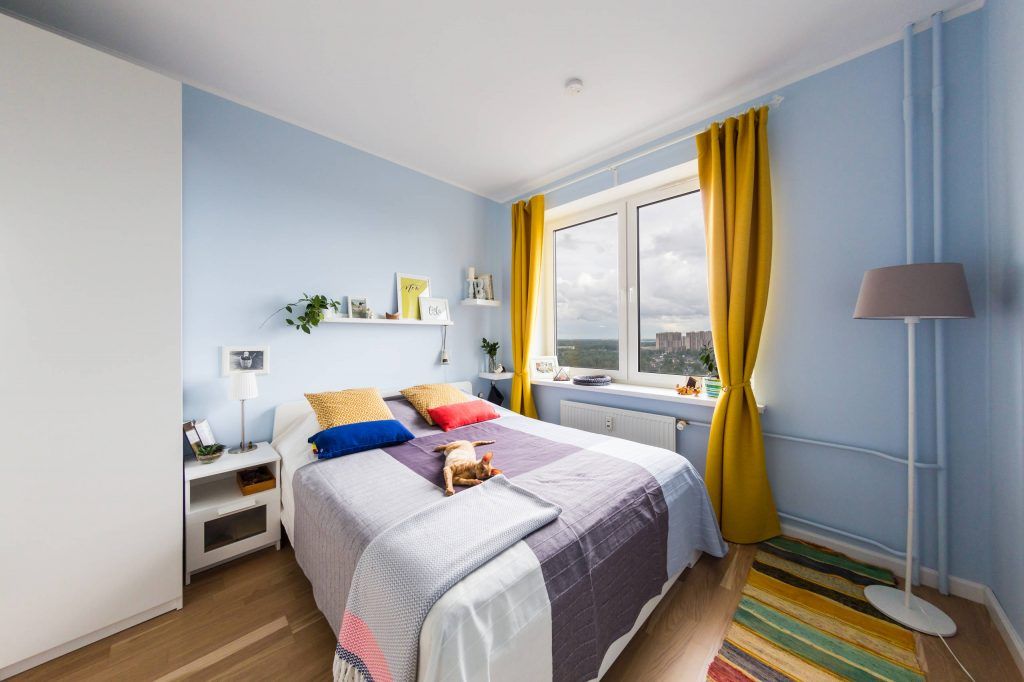 Dormitorul a fost ultima camera amenajata. Si aici regasim aceeasi paleta cromatica unde predomina un bleu-ciel ca baza a peretilor si tuse de galben si rosu echilibrate pentru a pastra un ambient placut si odihnitor.