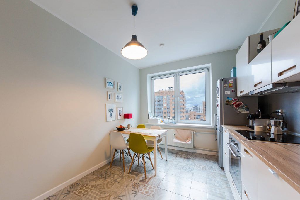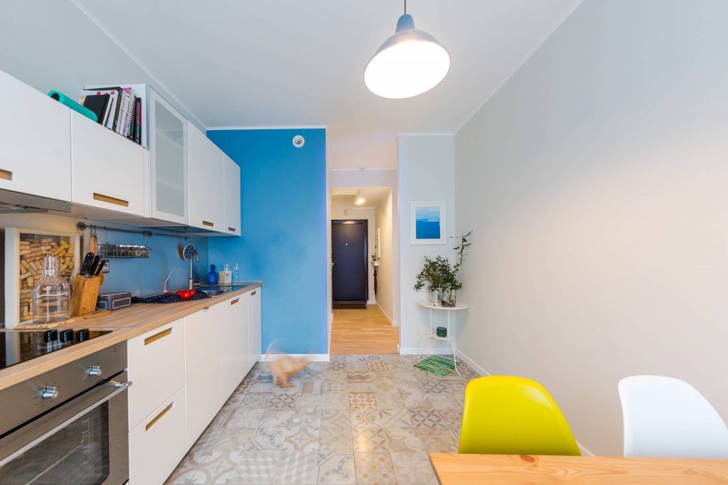 Primul pas facut a fost cel al zugravirii si inlocuirii finisajelor invechite. A optat pentru culori deschise, cu o baza de alb pe care a adaugat treptat accente de culoare, precum rosul, galbenul, albastrul in diferite nuante si tonuri adaptate fiecarei camere in parte. Pentru pardoseala a ales o nuanta deschisa de stejar care imprima caldura intregului apartament, exceptie facand bucataria si baia.