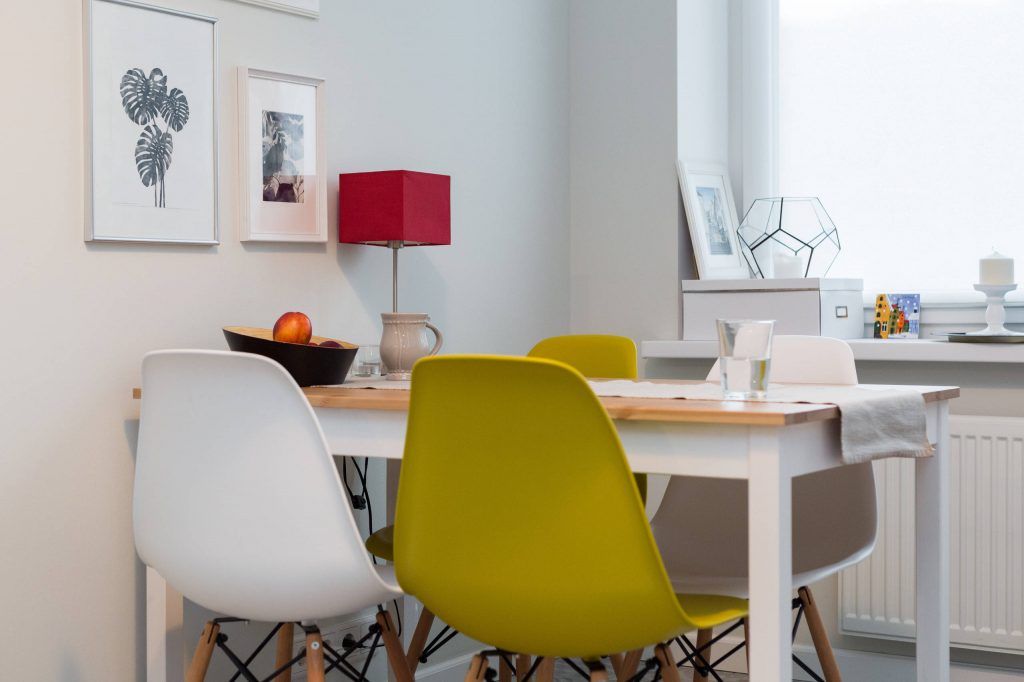 Si pentru bucatarie a fost gandita o amenajare functionala, cu tuse de culoare care inveselesc spatiul si ii reduc din caracterul tehnic. Cu mici accesorii din jurul mesei, plante, tablouri, lampa, bucataria se transforma intr-un spatiu nu doar pentru gatit, dar si pentru luat masa, stat cu prietenii, de lectura sau de lucrat. Peretele cu albastru, scaunele galbene si lampa rosie atrag privirea si contureaza o zona vesela si dinamica.
