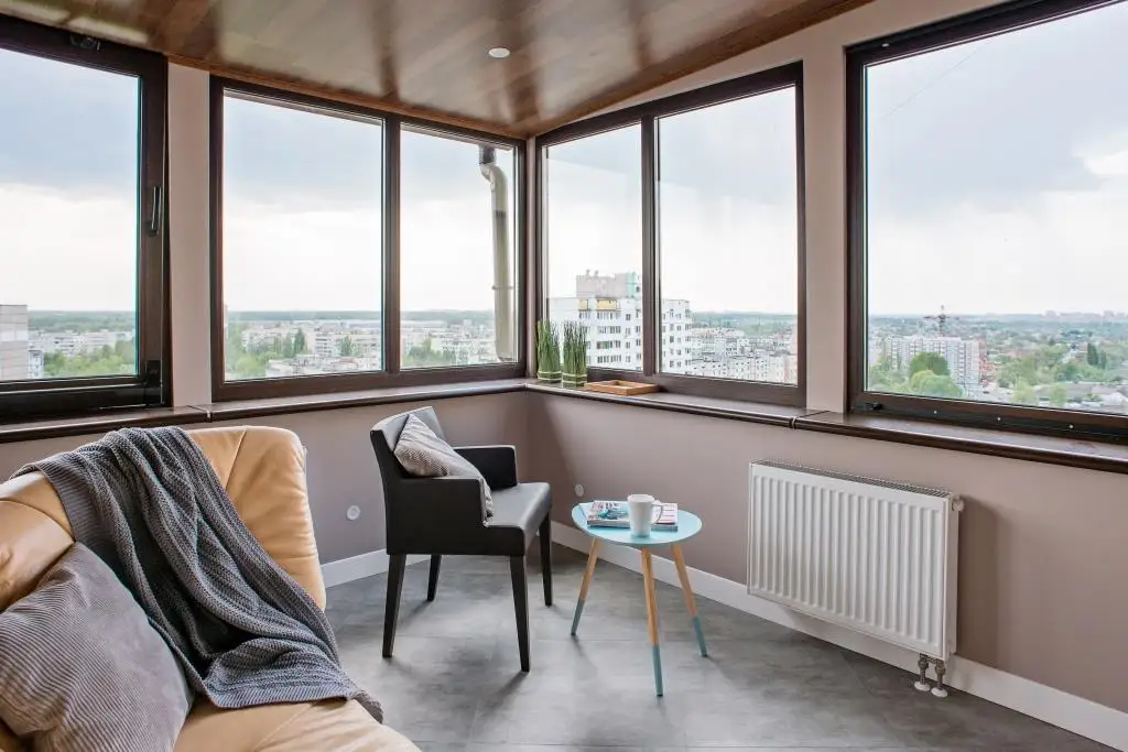 Zona de relaxare integreaza cromatica neutra care domina spatiul si o vedere panoramica exceptionala asupra intregului oras.