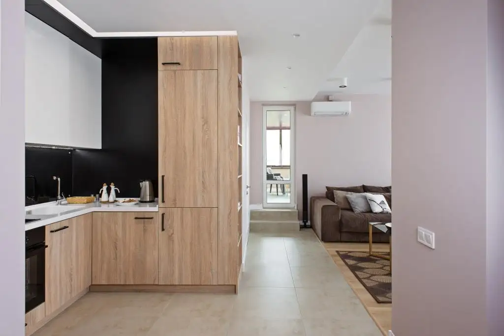 In bucatarie si in holul de la intrare, gresia delimiteaza vizual aceste spatii de camera de zi. Baia si zona de relaxare din balcon au parte la randul lor de un tip diferit de gresie, insa in aceleasi tonuri calde, neutre.