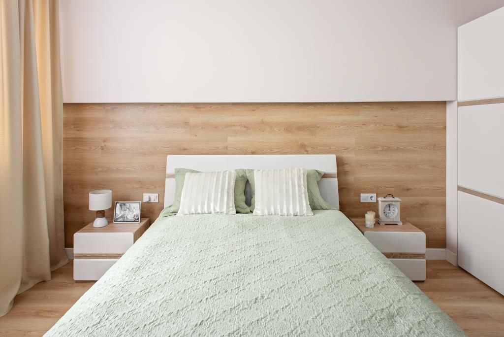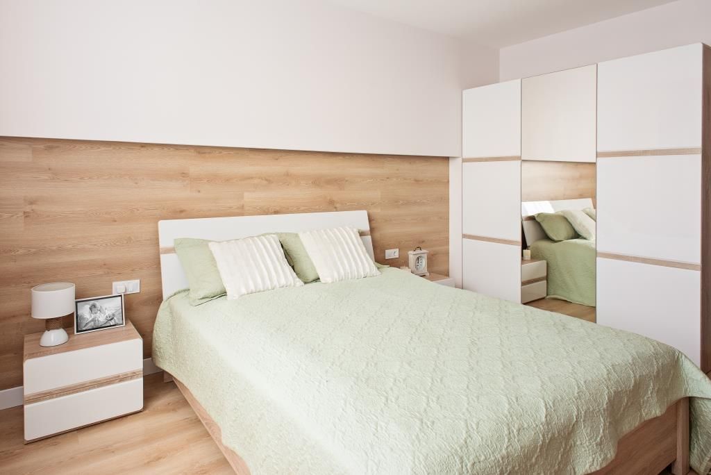 Acelasi tip de pardoseala din lemn a fost folosit in camera de zi si in dormitor pentru a accentua confortul din aceste zone. In dormitor, lemnul a fost utilizat inclusiv pe jumatatea peretelui din spatele patului, evitand senzatia de fragmentare si largind vizual spatiul.