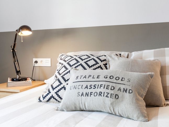 Cele doua dormitoare sunt amenajate simplu, minimalist, resimtindu-se aceleasi note industriale prin piesele de mobilier atent alese si prin vopsirea peretilor in nuante de griuri inchise doar pana la jumatatea inaltimii peretilor. Chiar si materialul de pe fetele pernelor decorative ne duc cu gandul la sacii pe care ii gasim in halele de depozitare.