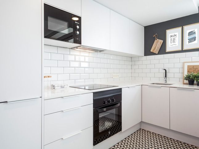 Zona de bucatarie este preponderent alba pentru a spori luminozitatea in incapere. Interesant este jumatatea de perete accent din dreptul ferestrei de la bucatarie, zugravit intr-o culoare inchisa, saturata cu tablouri si loc de agatat lucruri specifice zonei. Pentru a marca zona de gatit, s-a optat pentru o pardoseala diferita de cea din living.