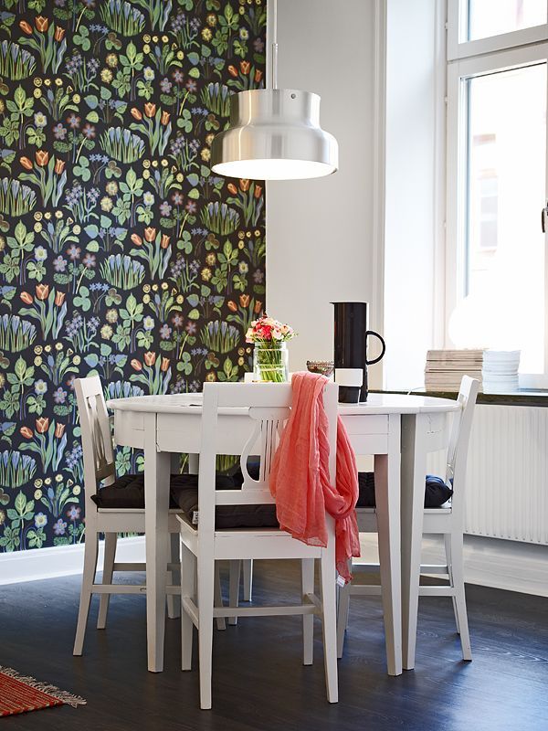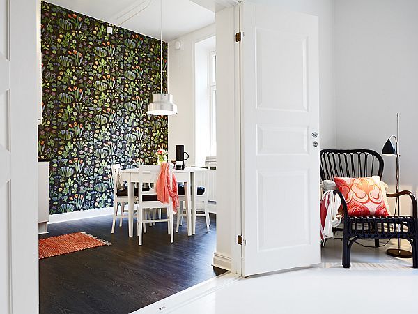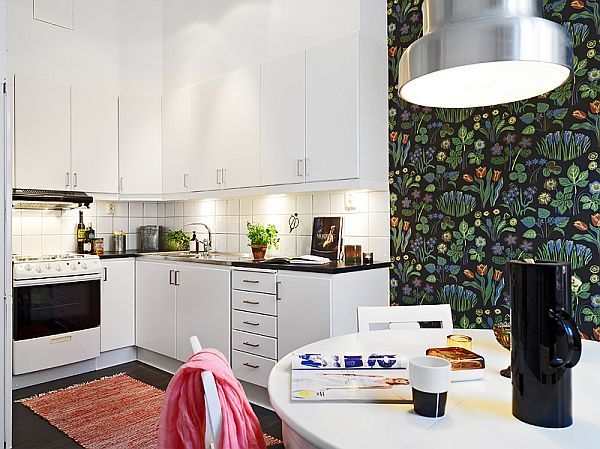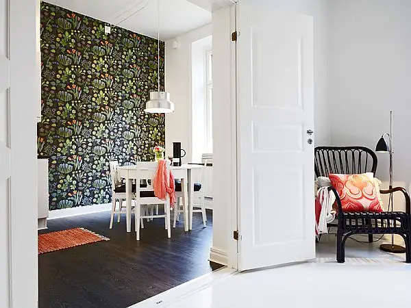 Zona dedicata bucatariei, desi o singura camera este separata vizual in zona de gatit si zona de dining printr-un tapet intens colorat. Chiar si podeaua este dintr-un lemn inchis la culoare, facandu-se astfel trecerea intre camere. O idee foarte buna pe care o putem adopta in orice tip de amenajare. Nici aici nu lipsesc elementele industriale sub forma corpului suspendat de deasupra mesei.