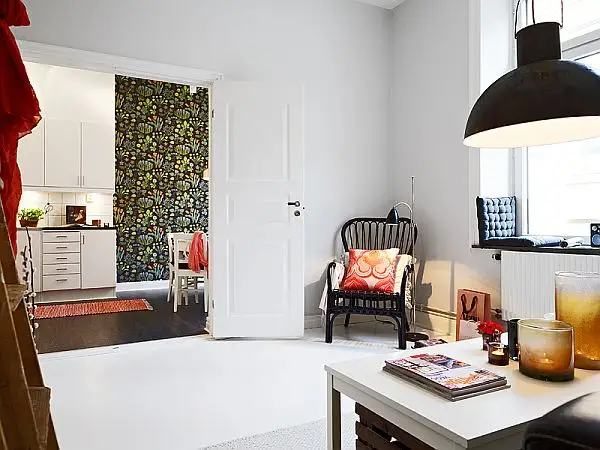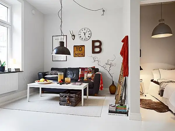 Mixul de stiluri este placut realizat. Un stil scandinav in forma pura, cu accente industriale fac din acest loc un apartament boem perfect pentru o persoana tanara, activa, mereu in miscare care apreciaza un trai minimalist. Accentele de negru completeaza bine amenajarea cu alb, spargand o eventuala monotonie care se poate instala atunci cand folosesti o singura culoare pentru toata casa.