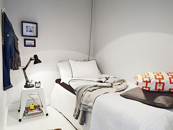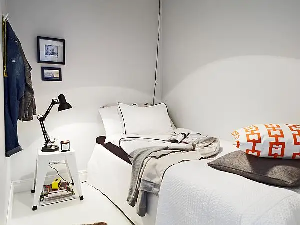 Dormitorul mic cuprinde doar un pat si un scaun pe post de noptiera, o lampa si mult alb. Dressingul il vom gasi pe hol, amenajat de sus pana jos, alb cu manere bineinteles negre.