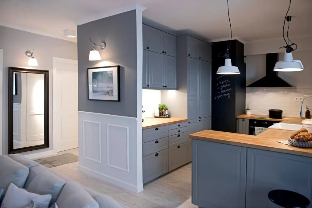 Pentru bucatarie nuantele de bleu-gri si accentele de negru creeaza o ambianta foarte placuta la care contribuie din plin luminile de accent. Cu o structura compacta, in forma de U, bucataria este complet functionala cu zone de lucru eficient amenajate si spatii de depozitare generoase.