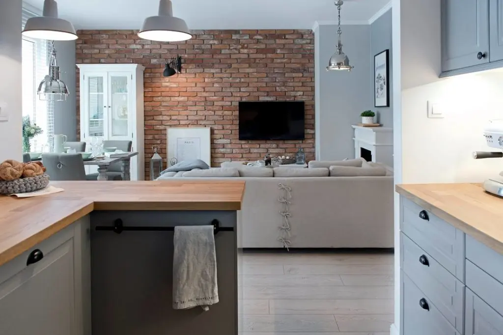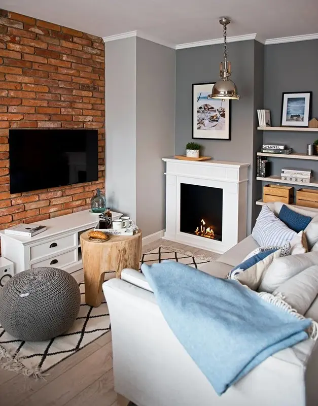 Zona de zi, un open space, cuprinde livingul, bucataria si diningul, o singura camera ce imbina armonios toate aceste functiuni. Peretele de caramida aparenta este principalul punct de atractie al incaperii conferind o textura aparte amenajarii. Lumina si caldura spatiului vin din finisajele de inspiratie naturala, iar cromatica preponderent neutra amplifica aceasta senzatie de spatialitate intr-o incapere de altfel nu foarte generoasa ca dimensiune. Mobilierul alb este o alegere inspirata pentru partea de living si dining. Semineul, tot alb, constituie un punct de interes in zona de conversatie a camerei.