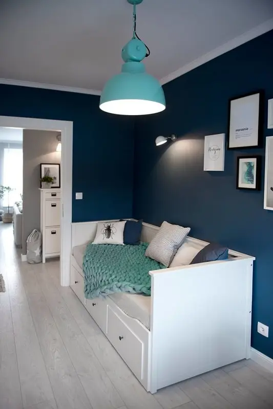Combinatia de bleu-pal si alb lasa locul unui albastru mai intens in camera dedicata biroului. Tusele de alb contrabalanseaza intensitatea culorilor si echilibreaza decorul.