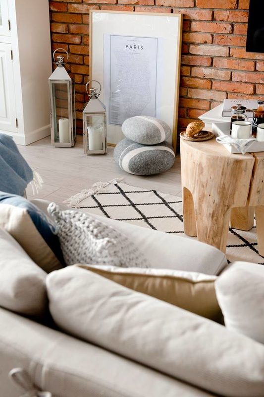 Zona de zi, un open space, cuprinde livingul, bucataria si diningul, o singura camera ce imbina armonios toate aceste functiuni. Peretele de caramida aparenta este principalul punct de atractie al incaperii conferind o textura aparte amenajarii. Lumina si caldura spatiului vin din finisajele de inspiratie naturala, iar cromatica preponderent neutra amplifica aceasta senzatie de spatialitate intr-o incapere de altfel nu foarte generoasa ca dimensiune. Mobilierul alb este o alegere inspirata pentru partea de living si dining. Semineul, tot alb, constituie un punct de interes in zona de conversatie a camerei.