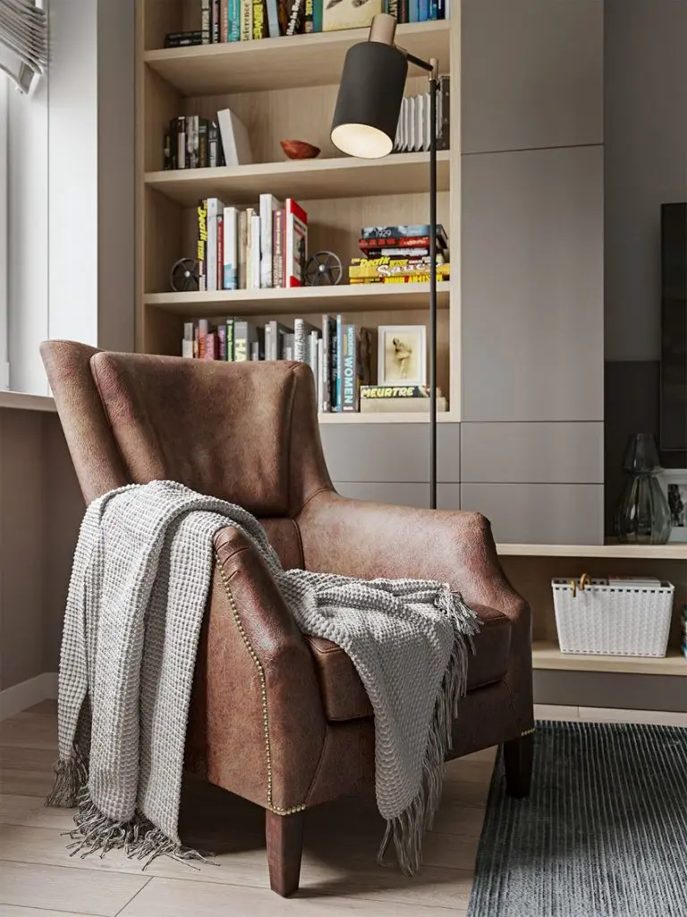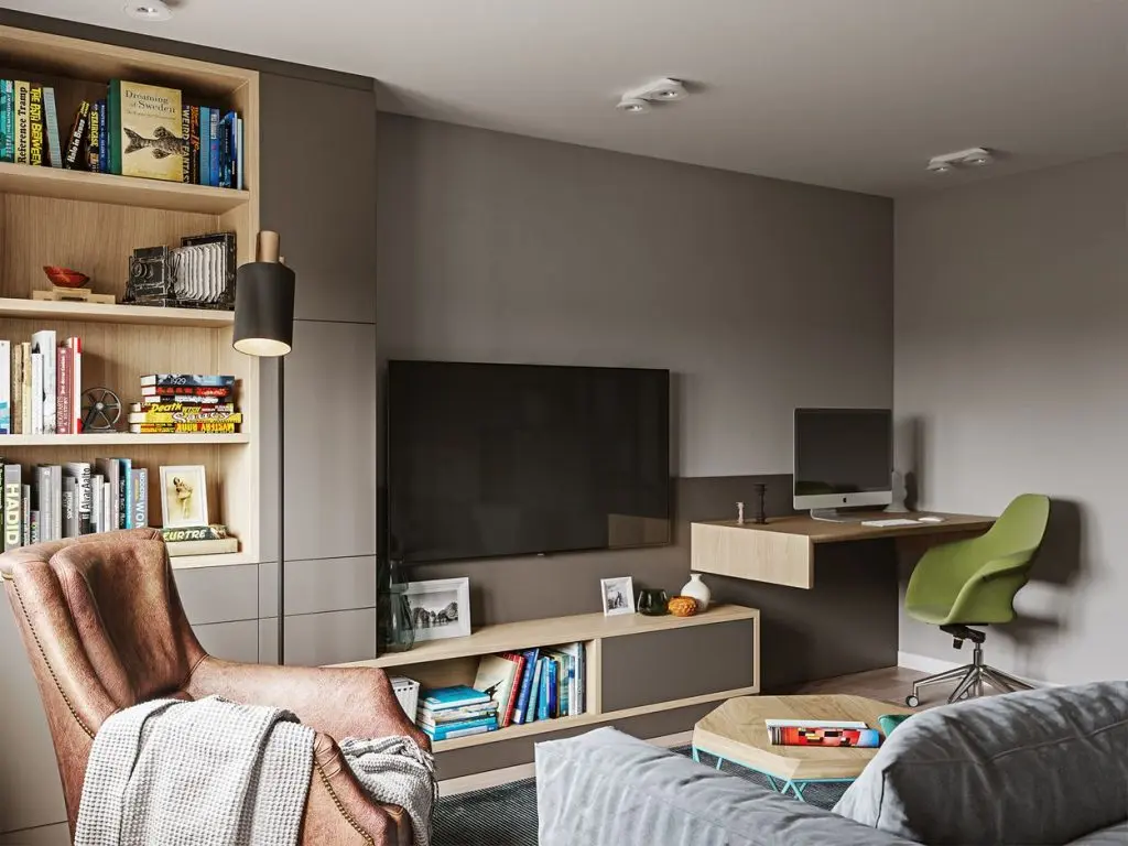 Cu ajutorul unui iluminat dispus uniform in camera, spatiul primeste o cantitate optima de lumina, potrivita pentru diverse activitati. Corpul de biblioteca a fost realizat pe comanda dupa schitele Irinei astfel incat sa se potriveasca intocmai dimensiunilor camerei. Acesta include rafturi pentru carti, dulapuri inguste inchise si o consola pentru zona T V.