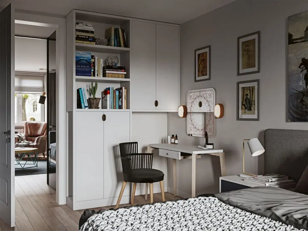 Eliberand camera de dulapurile mari, s-a putut amenaja un corp multifunctional ce include si o masuta de machiaj. Imbogatit cu decoratiuni si accesorii, spatiul capata personalitate si stil.