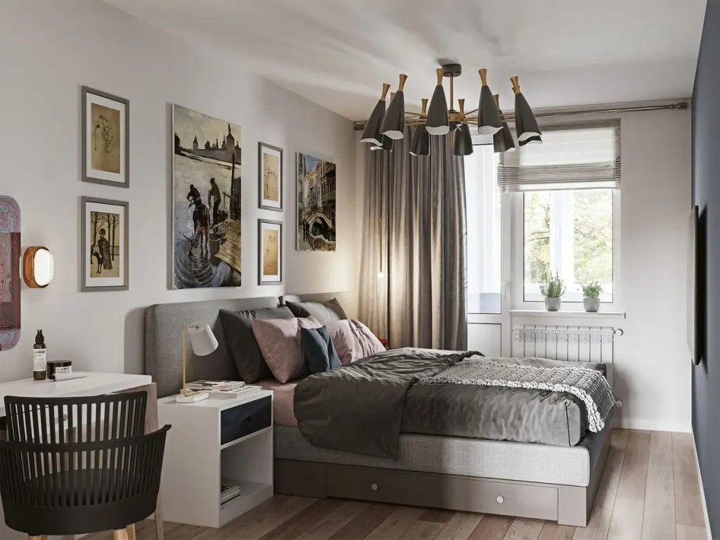 Pentru a pastra dormitorul cat mai aerisit, dulapurile cu haine au fost amenajate in hol, sub forma unui dressing cu usi glisante. Astfel, in dormitor, locul principal il ocupa patul cu o confortabila tablie tapitata si noptiere diferite pentru el si ea si corpuri de iluminat aferente, unul suspendat si cealalta sub forma unei veioze.